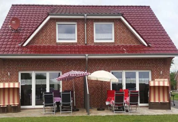 Ein gepflegter Garten mit Rasen sowie eine möblierte Terrasse mit Grill, Sonnenschirm und Strandkorb laden zum Verweilen ein. Ein großer Parkplatz steht am Haus zur Verfügung.